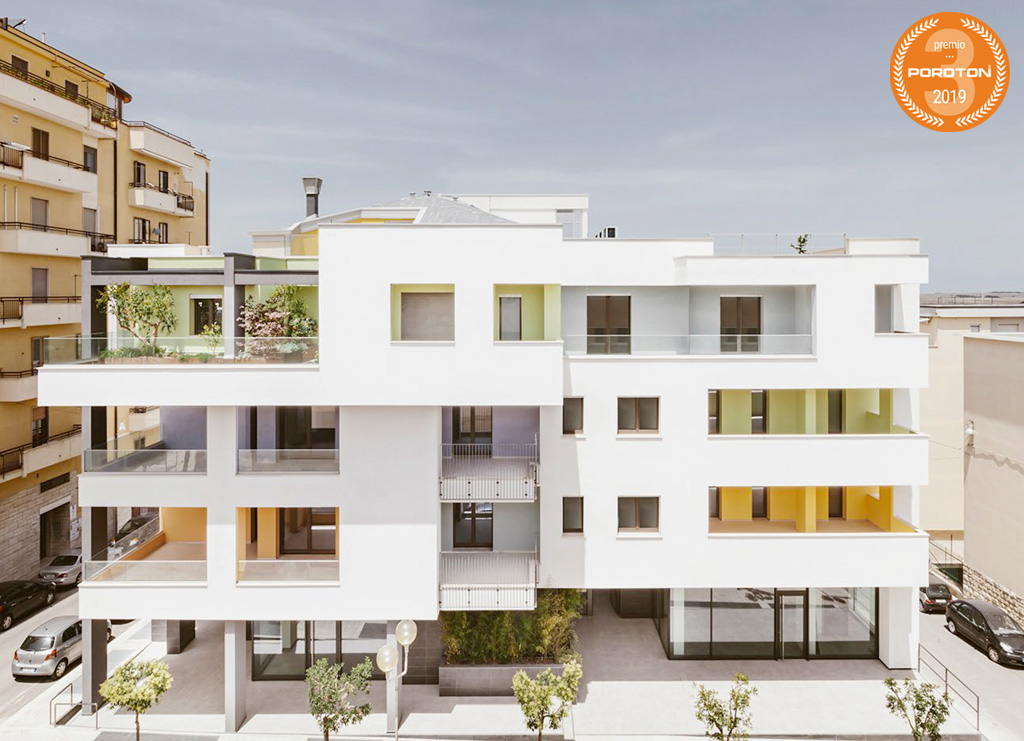 “Il progetto costituisce un esempio significativo di architettura residenziale integrata con spazi dedicati al terziario, non solo per aspetti legati alla composizione, al linguaggio, all’inserimento nel contesto, alla distribuzione degli spazi interni ed esterni ma, anche e soprattutto, per un attento utilizzo di sistemi passivi, di sistemi attivi e di dotazioni impiantistiche che gli hanno consentito di raggiungere la classificazione CasaClima Gold. Tra i sistemi passivi, oltre ad un particolare studio della forma, dell’orientamento/esposizione, dei materiali isolanti, si evidenzia l’utilizzo attento di murature di tamponamento realizzate con blocchi POROTON® ad elevata inerzia termica. Si apprezza inoltre l’uso del colore delle facciate esterne, studiato in base ad irraggiamento ed esposizione che, unitamente all’attento studio dei prospetti, degli sfondati e degli aggetti determina un’equilibrata composizione dei volumi dimostrando come la stessa si possa raggiungere anche con l’uso di tecnologie “tradizionali”.”