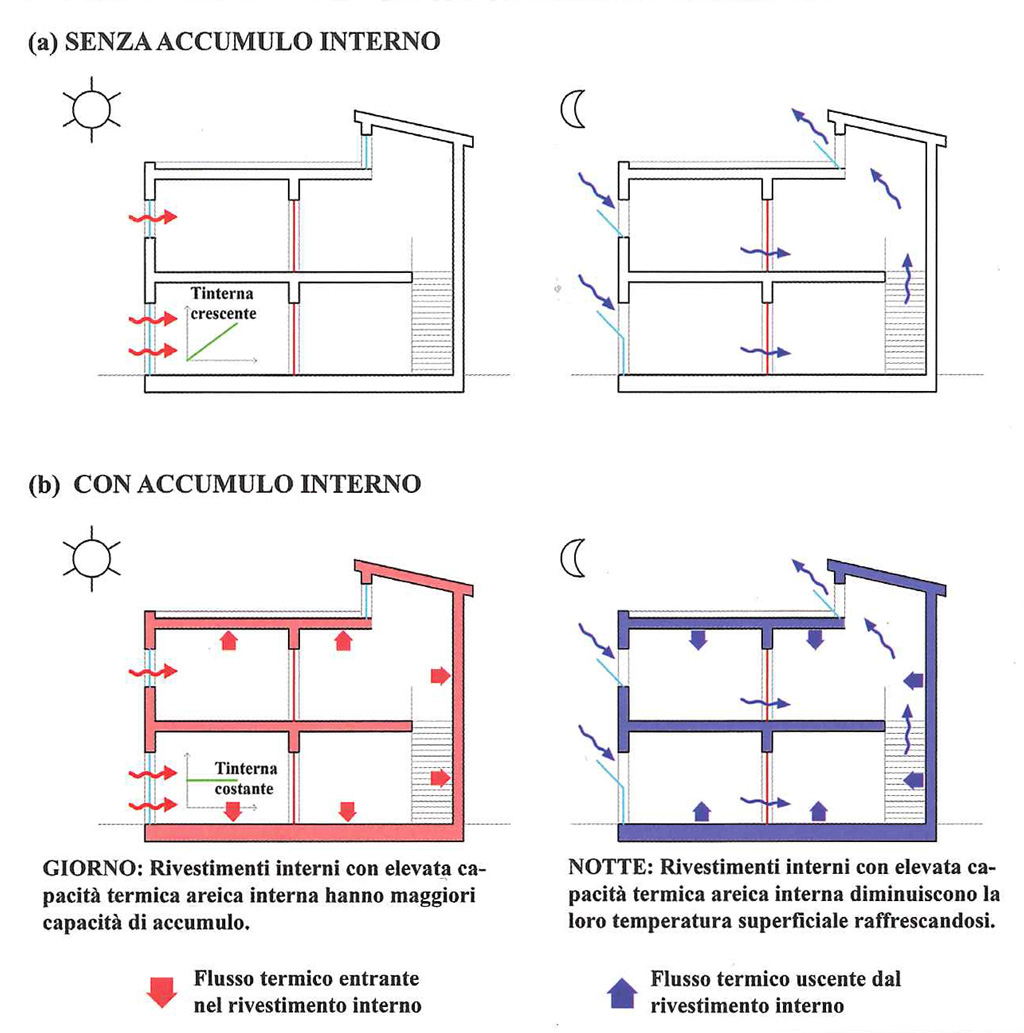 Studi recenti hanno dimostrato come nei nuovi involucri a “tenuta termica”, assuma sempre più importanza l’adozione di strati di finitura interna massivi che permettono di ridurre i picchi di calore interni.